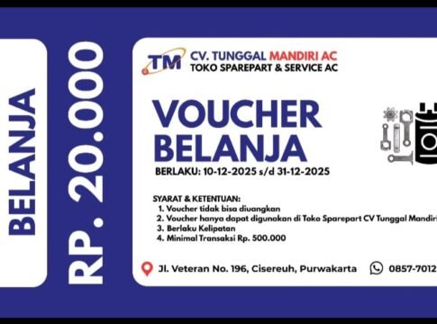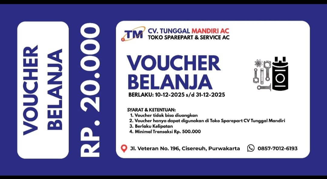 PURWAKARTA | ZONAINDUSTRI.COM | Menjelang akhir tahun, CV Tunggal Mandiri AC, toko sparepart dan layanan servis AC di Purwakarta, memberikan program promo berupa voucher belanja senilai Rp20.000 yang dapat digunakan mulai 10 hingga 31 Desember 2025.