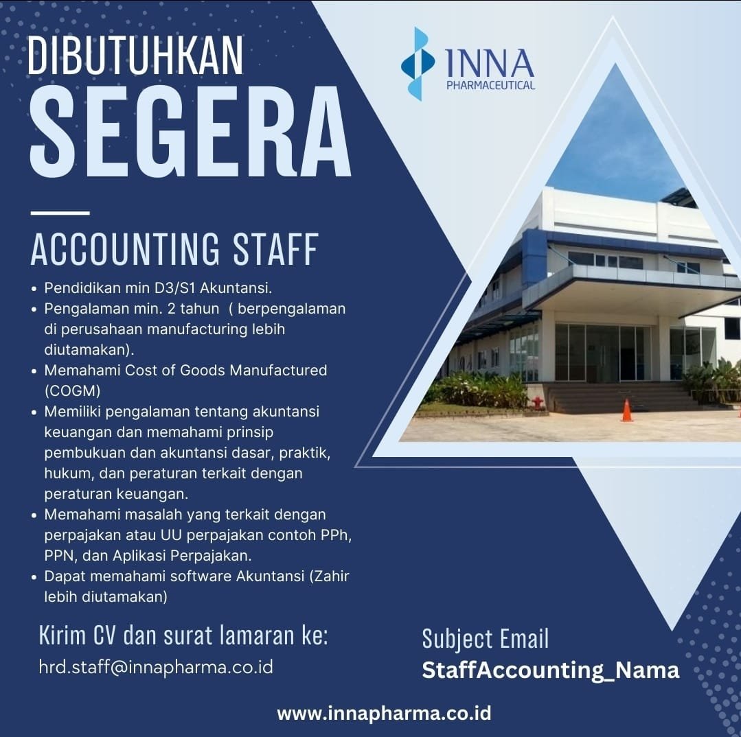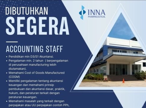 BOGOR | ZONAINDUSTRI.COM — Perusahaan farmasi nasional INNA Pharmaceutical kembali membuka peluang kerja bagi tenaga profesional. Kali ini, perusahaan membuka rekrutmen untuk posisi Accounting Staff guna memperkuat tim pengelolaan keuangan dan administrasi perusahaan.