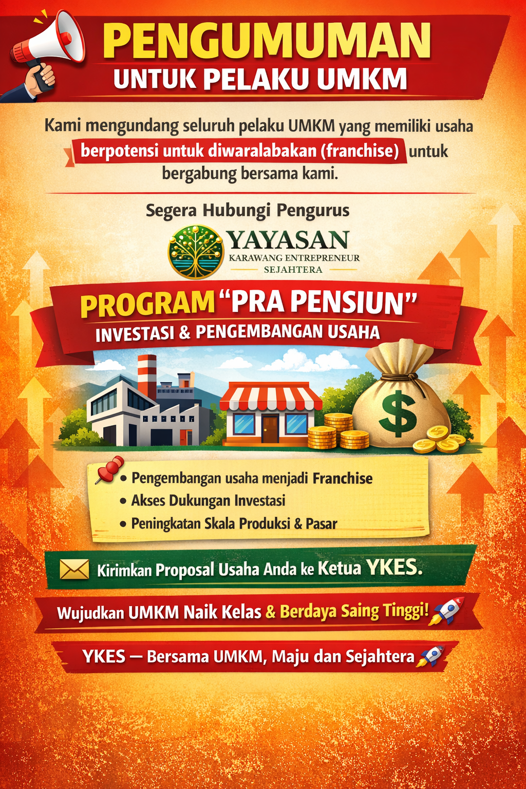 Karawang, 29 Maret 2026 – Yayasan Karawang Entrepreneur Sejahtera (KERSA) membuka peluang bagi para pelaku Usaha Mikro, Kecil, dan Menengah (UMKM) yang memiliki potensi untuk dikembangkan menjadi sistem waralaba (franchise).