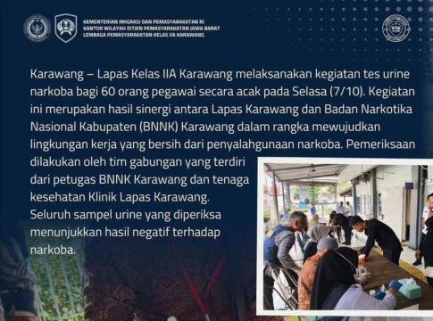 ZONAINDUSTRI.COM – KARAWANG – Sebagai upaya memperkuat integritas aparatur dan menciptakan lingkungan kerja yang bersih dari narkoba, Lembaga Pemasyarakatan (Lapas) Kelas III Karawang menggelar tes urine bagi 60 pegawai secara acak, Selasa (7/10/2025). Kegiatan ini dilakukan bekerja sama dengan Badan Narkotika Nasional Kabupaten (BNNK) Karawang.