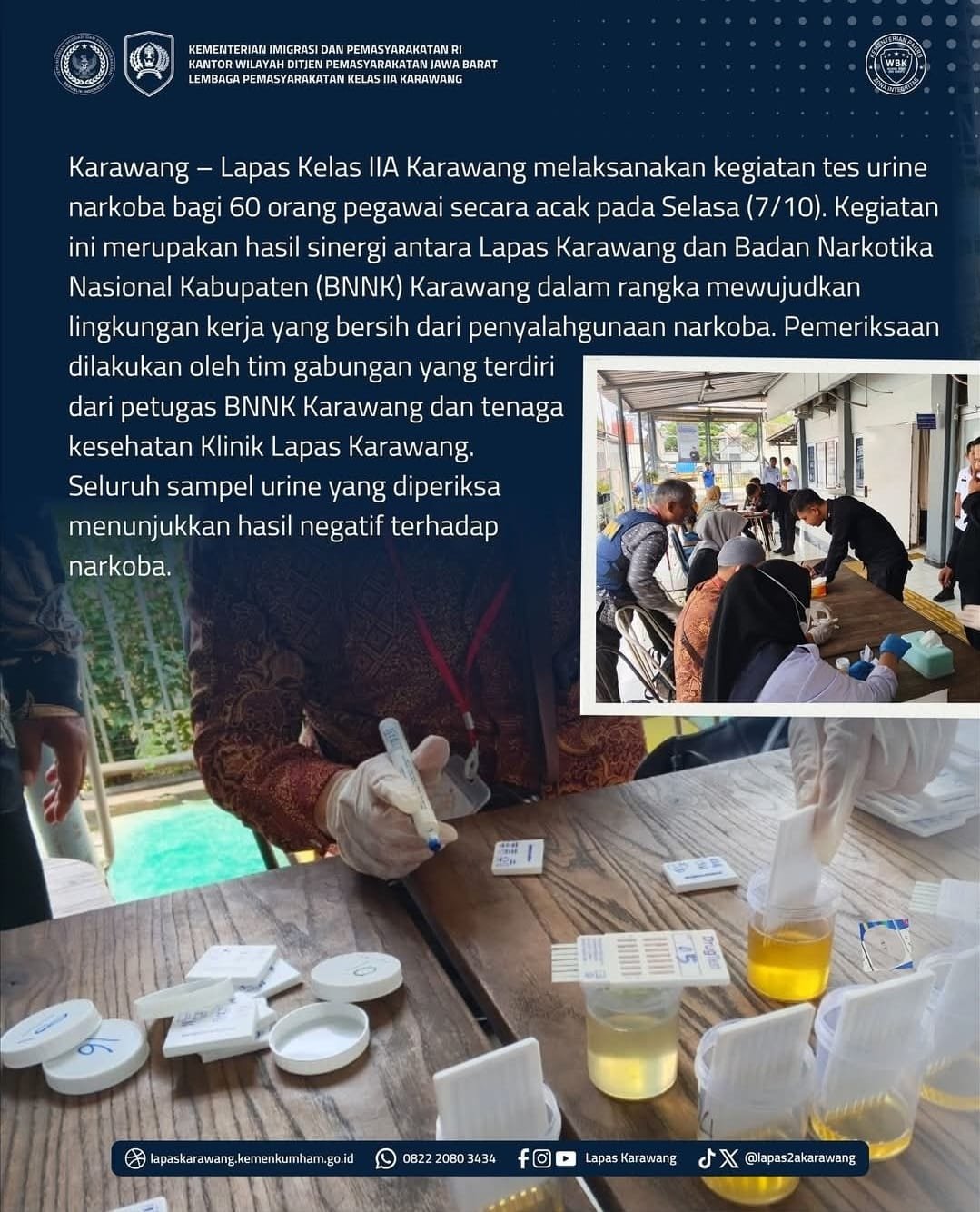 Pemeriksaan tersebut melibatkan tim gabungan dari petugas BNNK Karawang dan tenaga kesehatan Klinik Lapas Karawang. Berdasarkan hasil pemeriksaan, seluruh sampel urine dinyatakan negatif dari penyalahgunaan narkoba.