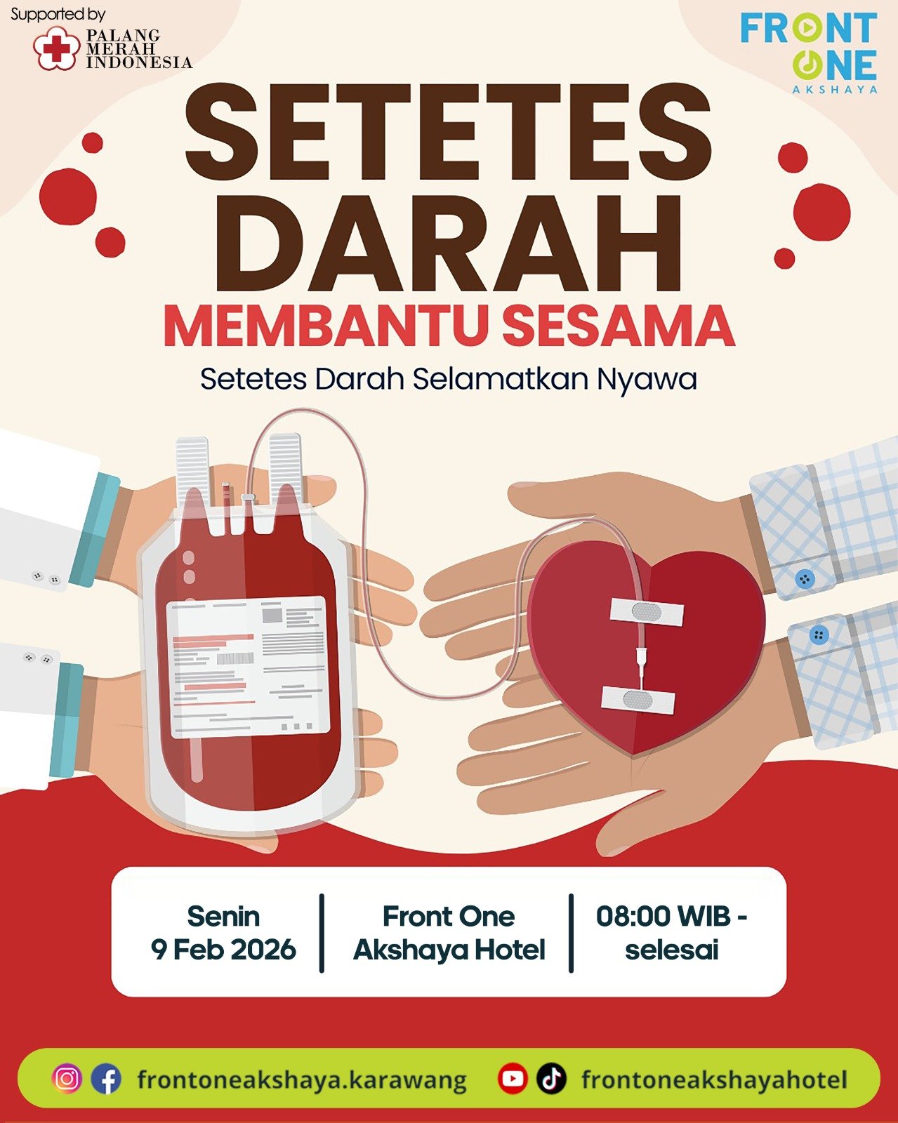 KARAWANG | ZONAINDUSTRI.COM – Aksi kemanusiaan kembali akan digelar oleh Front One Akshaya Hotel Karawang melalui kegiatan donor darah bertajuk “Setetes Darah Membantu Sesama” pada Senin (9/2/2026), mulai pukul 08.00 WIB hingga selesai.