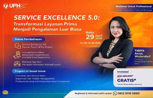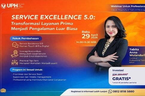 JAKARTA | ZONAINDUSTRI.COM– Universitas Pelita Harapan (UPH) Kelas Karyawan kembali menghadirkan program pengembangan kompetensi profesional melalui webinar bertajuk “Service Excellence 5.0: Transformasi Layanan Prima Menjadi Pengalaman Luar Biasa”. Kegiatan ini dijadwalkan berlangsung pada Rabu, 29 April 2026, pukul 14.00–15.30 WIB, secara daring melalui platform Zoom.